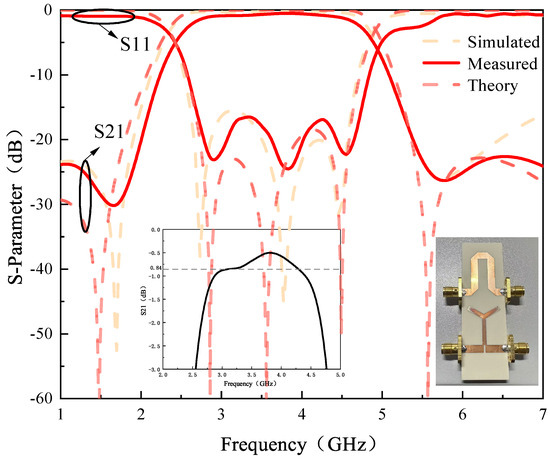 In order to demonstrate the proposed phase shifter, a broadband phase shifter with a center frequency of 3.6 GHz, a relative bandwidth of 60.8%, and a phase shift of 90° are designed and fabricated. The proposed phase shifter is realized on a single-layer microstrip structure. The substrate used is Rogers 4003 (ϵr = 3.55, tanδ = 0.0027, h = 1.524 mm). After further analysis and optimization using ADS2020 software, the instrument used for the measurements was a Ceyear 3672C. The final layout of the phase shifter is shown in Table 1, and the processing test shot is shown in Figure 8.