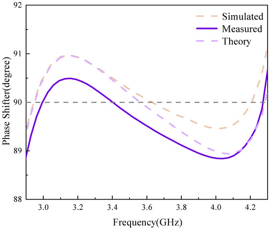 The magnitude response and phase response of the designed microstrip phase shifter are shown in Figure 8 and Figure 9. From Figure 8, it can be seen that the 3 dB bandwidth is 60.8% in the frequency range of 2.56–4.75 GHz, the minimum return loss is better than 16.5 dB, the insertion loss is less than 1.2 dB, and due to the use of input-output cross-coupling, two transmission zeros are introduced near the passband cutoff edge at 1.68 and 5.77. As can be seen in Figure 8, the phase shifter has a phase shift value of 90° ± 1.2° in the frequency range of 2.7–4.3. The measured results are largely consistent with both the schematic and layout simulation results. However, because the physical connections at the SMA interface and solder joints are idealized in the simulation, this can lead to slight variations in the resonant frequency, resulting in a measured frequency response that displays minor multiple resonances. To facilitate comparison with other reported studies, Table 2 has been prepared. It clearly shows that the phase error, insertion loss, return loss, and relative bandwidth in [5,9] are inferior to those of the current phase shifter. In [6], the alignment of the center frequency with the current phase shifter is more informative; although its insertion loss (better than 0.6) surpasses that of the current phase shifter (better than 0.84), its phase error, return loss, and relative bandwidth are not as favorable. This highlights the excellent phase shift accuracy of the proposed phase shifter. The phase shift range in [8] can achieve 0–360°, and its insertion loss and relative bandwidth are slightly superior to those of the current phase shifter. However, with a phase error of up to 10°, the advantage of the current phase shifter in terms of minimal phase error becomes more pronounced. Furthermore, the phase shift range and phase error in [10,16] do not match those of the current phase shifter. While the insertion loss, return loss, and relative bandwidth in [10] are better, the complexity of its structure makes processing and fabrication more challenging than for the current phase shifter.