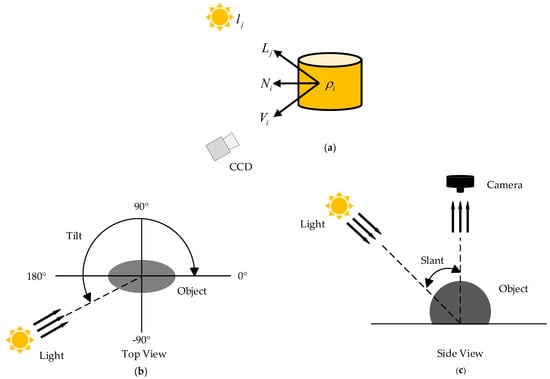 Light angle diagram of the photometric stereo method. (a) Schematic diagram of photometric stereo method; (b) light angle tilt; (c) light angle slant.