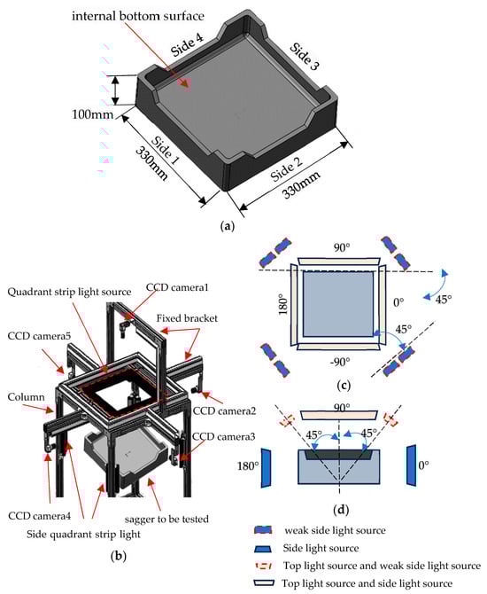 Surface curvature map acquisition platform setup. (a) Sagger schematic; (b) schematic diagram of image acquisition frame; (c) top view of light distribution; (d) side view of light source distribution.