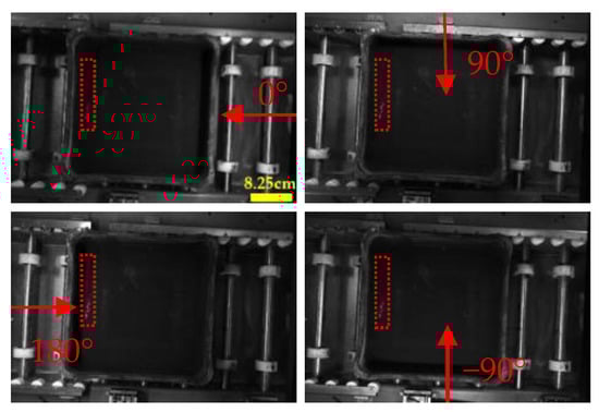 The surface curvature map acquisition platform and parameter configurations, shown in Figure 2 and Table 1, consists of a sagger, a four-region combined light source (KOMA, Dongguan, China), a light source controller (KOMA, Dongguan, China), and a cameral (HIKVISION, Hangzhou, China). The light source controller sequentially activates the light sources from four directions to illuminate the sagger, capturing images from different angles. According to the principles of the photometric stereo method described earlier, these images are used to construct the sagger’s surface curvature map. Figure 3 shows the four images taken from different angles (0°, 90°, 180°, and −90°), and Figure 4 shows the resulting surface curvature map. A comparison between Figure 3 and Figure 4 highlights that while crack defects are not evident in the grayscale images, they are clearly visible in the surface curvature map.