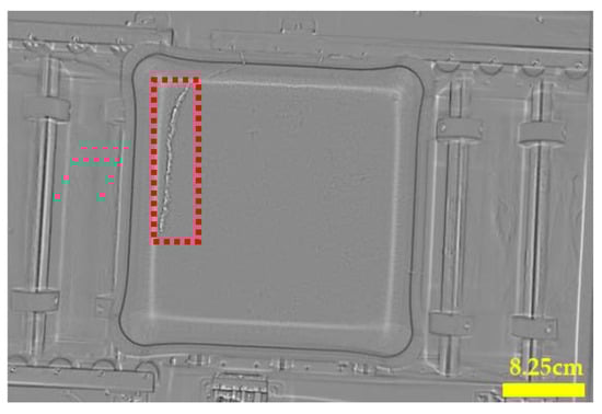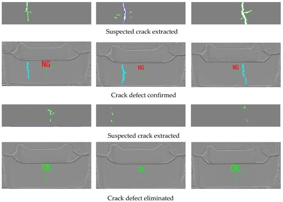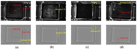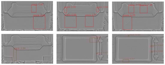 By taking the defect area detected by the improved YOLOv5s as the candidate area, crack feature extraction and comprehensive scoring were used to confirm whether it was a crack, capitalizing on the method proposed in Section 4. The detection results for some saggers are shown in Figure 19.