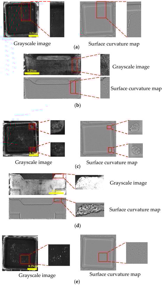 Comparison of grayscale and surface curvature maps of sagger defects. (a) Cracks are not visible due to a dark background; (b) cracks are obscured by surface fouling; (c) damage defects are not visible due to a dark background; (d) damage defects are not visible due to overexposure; (e) caused by the corrosion of ternary cathode materials.