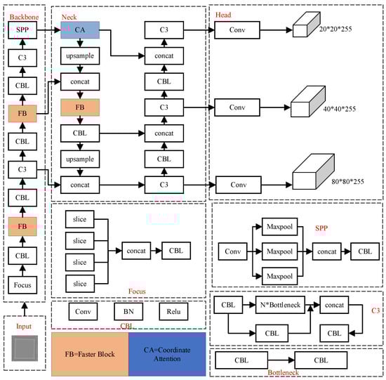 First, the FasterNet Block (FB) model structure is introduced to replace the original CSPNet structure in the backbone network. Then, an efficient attention mechanism called coordinate attention (CA) [] is added after the spatial pyramid pooling (SPP) [] structure. The overall improved structure is shown in Figure 6, where all the orange modules indicate the replacement positions of the Faster Block module, and the blue modules represent the coordinate attention mechanism. The detailed structure of the Faster Block and CA modules will be presented in the subsequent sections.