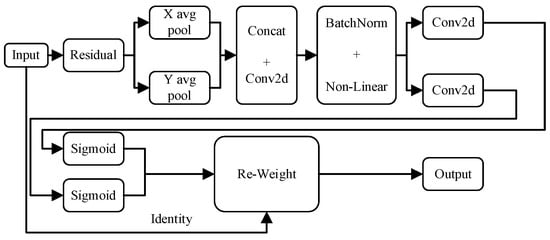 After obtaining the feature maps along the width and height dimensions, they are concatenated and subjected to a 1 × 1 convolution operation to reduce the dimensionality to , where denotes the number of channels and r denotes the percentage of dimensionality reduction. The connected feature maps are then batch normalized and nonlinearly activated, splitting the feature maps into width and height dimensions. Convolution and Sigmoid [] activation functions are subsequently applied. Finally, the two outputs are re-weighted along with the original residual module, and the weights obtained through learning are applied to different positions of the input feature maps. This makes the network more flexible and adaptive in processing the input feature maps, thereby improving model performance in target detection and localization tasks.