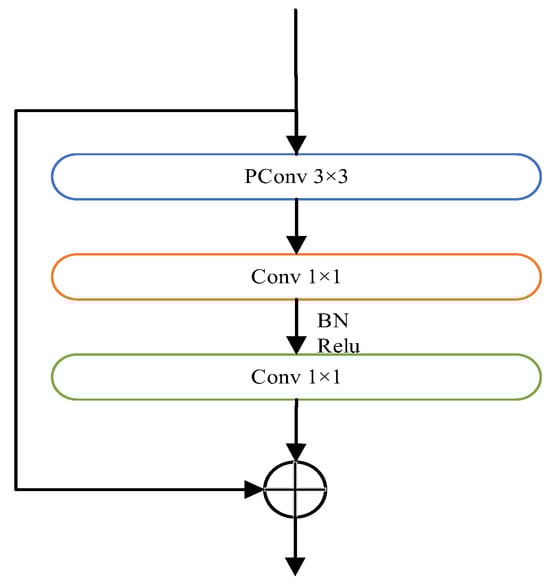 The proposed FasterNet Block structure efficiently extracts effective features with faster neural network operations, enhancing the performance of the target detection model. The model structure is shown in Figure 9. The PConv structure includes two subsequent 1 × 1 convolution blocks. Between the last two 1 × 1 convolutions, batch normalization (BN) [] and rectified linear unit (ReLU) [] activation functions are applied. This setup preserves the diversity of features, with the residual structure and constant mapping being merged as the final result.