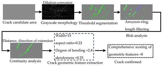 To further reduce the misjudgment rate of crack defects, the improved YOLOv5s detection result area is used as the recognition area. The deep learning target area is then confirmed to be a crack or not through processing steps such as grayscale morphology, threshold analysis, speckle analysis, crack shape feature extraction, and crack feature scoring. This process is shown in Figure 10.