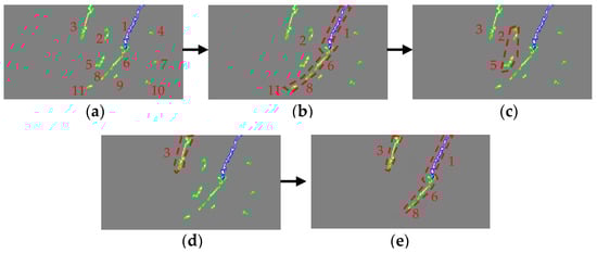 Initially, crack Region No. 1 in Figure 11a is used as the seed region. All remaining crack regions and seed regions are evaluated based on distance and extension direction; regions that meet the criteria are considered connected and form the final confirmed crack defects. Through the first round of analysis, it was determined that Region No. 1 might theoretically form a continuous crack region with Regions No. 6, 8, and 11. The results of this analysis are illustrated in Figure 11b. Subsequently, using Region No. 2 in Figure 11b as the seed region, the same analytical approach was applied to all crack regions in the image. The analysis revealed that Region No. 5 exhibited similar characteristics to Region No. 2 in terms of distance and extension direction, as shown in Figure 11c. Next, Region No. 3 in Figure 11c was selected as the seed region, and all crack regions were traversed again for continuity analysis. The results indicated that Region No. 3 did not exhibit any associations with other regions, as depicted in Figure 11d. Finally, based on the predefined judgment criteria, certain regions, including Regions No. 4, 7, 9, and 10, were excluded during the seed region selection process due to their failure to meet the crack conditions. Additionally, regions such as No. 2, 5, and 11, which did not align with the crack characteristics, were also excluded. Ultimately, it was concluded that Regions No. 1, 6, and 8 collectively belonged to the same continuous crack, while Region No. 3 was identified as an independent crack region. The final results are shown in Figure 11e.