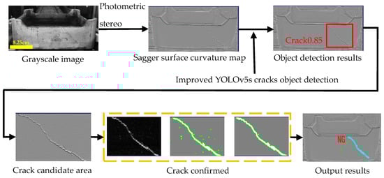 The experimental flow of sagger crack defect detection is depicted in Figure 13. The procedure begins with the input of the original grayscale image, followed by obtaining the surface curvature map using the photometric stereo method. Next, the improved YOLOv5s crack target detection algorithm is applied to obtain the target detection result. The crack candidate area identified from target detection is then preprocessed to confirm the crack. Finally, the crack is shown on the sagger.
