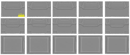 The sagger defect detection, inspection system, and site layout for a ternary battery chemical plant production line are shown in Figure 14. The bar light source (KOMA, Dongguan, China) evenly illuminates the sagger. The software control interface on the computer (Intel i5 12400, Santa Clara, CA, USA) controls the four bar light sources to illuminate and capture images of the sagger from four different angles via the light source controller. This process results in four images with light source illumination at different angles, which are then used to obtain the surface curvature map through the photometric stereo method. The acquired surface curvature map is shown in Figure 15.