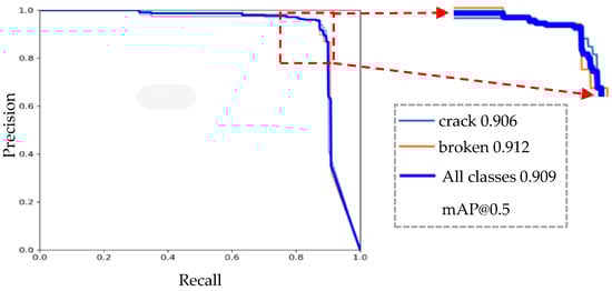 As shown in Figure 16, the dataset includes crack and breakage instances during the training process, with the average accuracy of crack detection being 90.6%. Figure 17 shows the detection results of the improved YOLOv5s algorithm model on saggers. The model shows a good detection effect. By utilizing the surface curvature map information, the improved model can more accurately locate and detect the position of sagger defects in complex backgrounds, reducing both false positives and false negatives, and thereby improving detection accuracy.