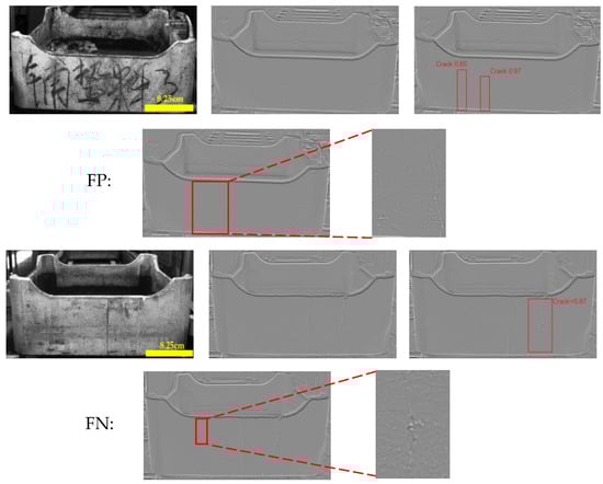 Even with the reflectance map proposed in this study combined with the improved YOLOv5 for defect inference, false positives and false negatives still occur in the presence of complex surface interferences, as shown in Figure 18. False positives are primarily caused by disturbances such as ink stains and smudges, where significant variations in surface grayscale values can produce large curvature features. Some disturbances with curvature characteristics similar to cracks may be mistakenly identified as defects; however, these misclassifications are typically eliminated during subsequent geometric feature evaluation. False negatives, on the other hand, occur when shallow cracks lack sufficiently prominent curvature features and are obscured by the uneven surface of the sagger, leading to potential missed detections.