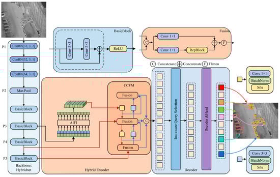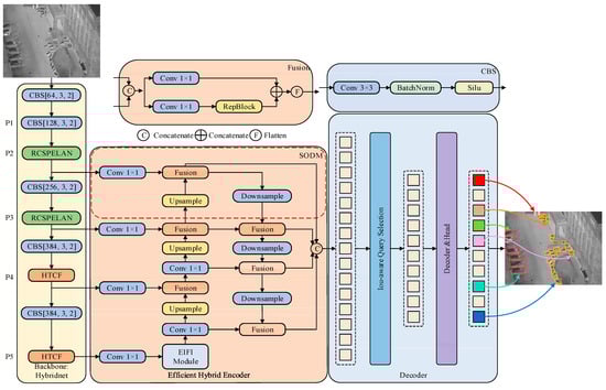RT-DETR employs ResNet [12] as its backbone network for feature extraction, utilizing a transformer encoder for global correlation at the final layer of the feature extraction network. In the neck network, a CCFM structure similar to PAFPN [13] is established, where fusion modules merge feature maps through top-down and bottom-up pathways. After selecting top-k queries, the dense predictions from fusion modules are fed into the decoder for final predictions. However, in UAV aerial imagery applications, several limitations persist: first, the multi-level downsampling modules result in substantial information loss regarding small objects, hindering the accurate capture of fine-grained features [14]. Second, the high correlation between feature maps leads to redundant computations in standard convolutions [15]. Furthermore, the neck network’s traditional pyramid structure fails to effectively utilize the correlations between different feature maps, resulting in suboptimal fusion performance. Finally, the model’s Generalized Intersection over Union (GIoU) loss degenerates to IoU when predicted boxes overlap with ground truth boxes, leading to increased vertical errors and slower convergence rates [16].
