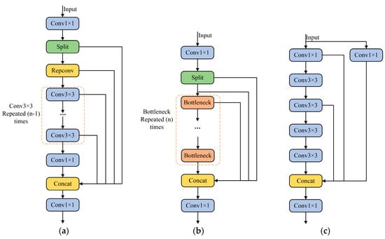The structure of RGCSPELAN, CSPNet, and ELAN. (a) RGCSPELAN; (b) CSPNet; (c) ELAN.