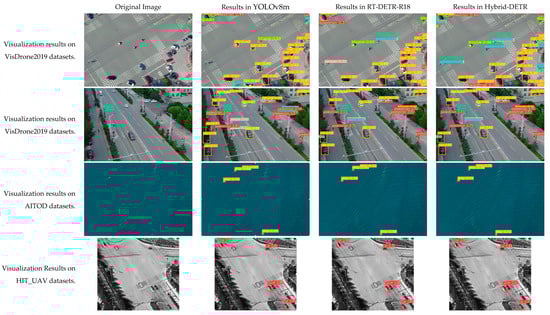 To verify the applicability and generalization ability of the small-object detection by Hybrid-DETR algorithm, we conducted comparative experiments on the VisDrone2019, HIT-UAV, and AI-TOD datasets. The experimental results are shown in Table 6.