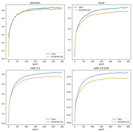 As shown in Figure 8, the results demonstrate that our model significantly outperforms the original RT-DETR-R18 in both precision and recall. The precision curve shows that our model maintains high stability during training, quickly converging to a high precision level. In contrast, RT-DETR-R18 exhibits precision similar to ours in the early stages of training but experiences considerable fluctuations in later stages, eventually stabilizing at a slightly lower precision than our model.