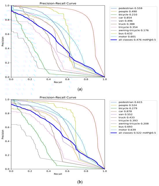 Precision–recall curve on the VisDrone validation set: (a) result of RT-DETR-R18; (b) result of Hybrid-DETR.