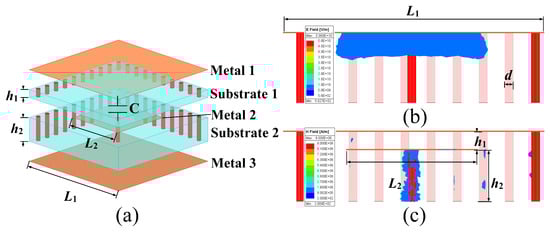 Figure 1a illustrates the geometric configuration of the capacitive-loaded QMSIW resonator proposed in this paper. This resonator comprised two dielectric layers and three metallic layers. A metal–insulator–metal capacitor composed of metal1 and metal2 is loaded into the QMSIW resonator through a metal blind via. In a metal–insulator–metal capacitor, gold is used for the upper metal layer, while silver is used for the lower metal layer. In the resonator configuration, denotes the width of the QMSIW resonator, represents the width of the loaded capacitor patch, indicates the vertical separation between the capacitor patch and the upper metal layer, signifies the vertical separation between the capacitor patch and the lower metal layer, and d refers to the diameter of the metallic aperture within the resonator. The capacitance of the MIM capacitor is influenced by the parameters and . Reducing or increasing can increase the capacitance of the loaded capacitor. The incorporation of the capacitor within the QMSIW resonator leads to a significant reduction in the resonant frequency, which is advantageous for minimizing the dimensions of the filter. The internal electromagnetic field distribution of the capacitive-loaded QMSIW resonator is illustrated in Figure 1b,c. The electric field in the resonator is mainly distributed between the MIM capacitor patch and the top metal layer. The magnetic field is primarily concentrated in the area surrounding the metal blind via.