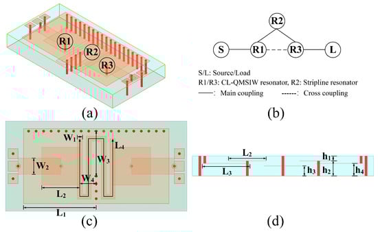 The structure of the proposed hybrid filter. (a) A three-dimensional perspective of the filter. (b) The coupling topology structure of the filter. (c) A top–down view. (d) A lateral view.