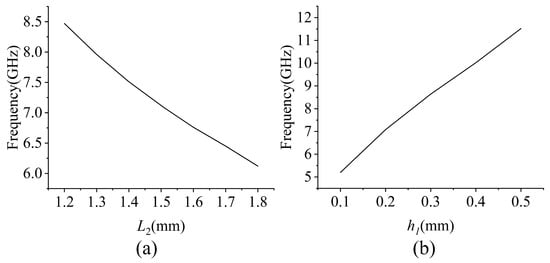 According to the resonance Equations (3)–(5) of the CL-QMSIW resonator, the resonant frequency of the resonator can be effectively changed by adjusting the size of the loaded capacitance value. The MIM capacitance value loaded is related to the space between the upper and lower capacitor patches and the width of the lower capacitor patch. In order to verify the working principle of the CL-QMSIW resonator, high-frequency structure simulator software was used to analyze the influence of different structural parameters on the resonant frequency of the CL-QMSIW resonator. Figure 6a shows the correlation between the width of the lower capacitor patch and the resonant frequency of the CL-QMSIW resonator. An increase in the width of the capacitor patch results in a corresponding increase in capacitance, which in turn leads to a decrease in the resonant frequency. This phenomenon is advantageous for the miniaturization of the resonator. Figure 6b shows the relationship between the space between the upper and lower capacitor patches of the CL-QMSIW resonator and the resonant frequency. As the spacing increases, the capacitance value diminishes, resulting in an increase in the resonant frequency. By analyzing the curve presented in Figure 6, = 0.2 mm and = 1.51 can be obtained. For the half-wavelength stripline resonator R2, the half-wavelength associated with a frequency of 7 GHz is calculated to be 8.8 mm, taking into account the substrate thickness and the relative permittivity of the dielectric material. The mutual coupling of the bent sections of the stripline results in a decrease in the electrical length of the stripline. Through adjustments and simulations of the stripline resonator’s length, the length of resonator R2 is determined to be = 10.5 mm.