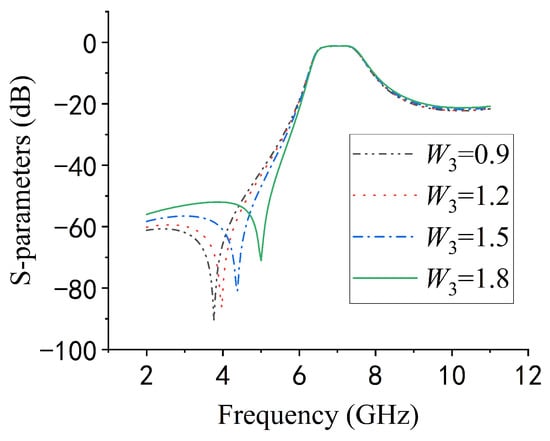 In order to validate the mechanism of cross-coupling among resonators that results in the generation of TZs, a parameter sweep was conducted on the coupling window width, denoted as , between resonators R1 and R3. The outcomes of the filter simulation are presented in Figure 9. The filter exhibits a passband ranging from 6.6 GHz to 7.4 GHz, which is characterized by a lowest IL of 1.1 dB. It was observed that as the coupling window width increases, the TZ of the filter approaches the passband. The location of the transmission zero can be flexibly adjusted by adjusting the width of the coupling window. When = 1.8 mm, the filter achieves a TZ at 5 GHz, and the suppression level at 5 GHz reaches −70 dB. At this configuration, the coupling coefficient , derived from the simulation for cross-coupling, is 0.02, which aligns with the coupling coefficient calculated via the coupling matrix M. This correlation substantiates the validity of the mechanism responsible for generating TZs through cross-coupling.