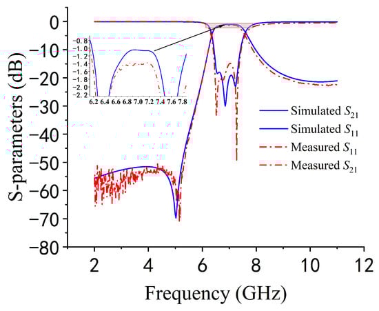 In order to validate the filter proposed in this study, LTCC technology was employed for its fabrication. Figure 10 presents an image of the fabricated filter, with a core dimension of only 5.8 mm × 3 mm (0.33× 0.17). The vector network analyzer is used to measure the filter. Figure 11 presents a comparative analysis of the measurement outcomes of the filter in conjunction with the results obtained from simulations. There is a strong correlation between the measurement outcomes of the filter and the results obtained from the simulations. The measurement results show that the center frequency of the filter is 7 GHz, the 3 dB bandwidth is 0.8 GHz (with a fractional bandwidth of 11.4%), and the lowest IL within the filter band is 1.4 dB. The flatness of the filter within the passband is 0.8 dB. The filter generates a TZ at 5.1 GHz, which enhances the out-of-band suppression of the filter. The suppression level of the filter at 5.1 GHz reaches −70 dB. In comparison to the simulation outcomes, the measured transmission zero exhibited a shift toward higher frequencies by 0.1 GHz. This shift can be attributed to the precision of the hole positioning within the LTCC manufacturing process, which has an accuracy of ±20 μm. Variations in the hole positioning lead to an expansion of the cross-coupling window width, denoted as , thereby resulting in the observed shift of the transmission zero to higher frequencies. The measurement results of the proposed filter indicate that its compact dimensions and elevated selectivity render it appropriate for incorporation into RF microsystems.