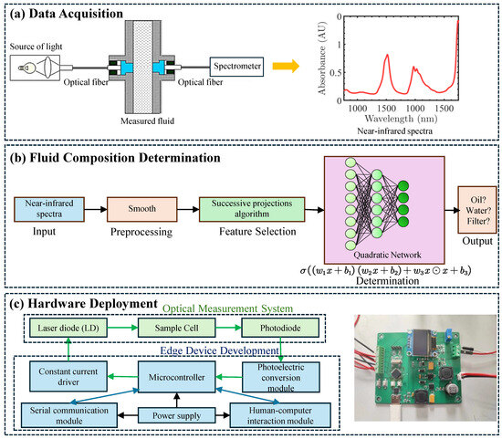 As depicted in Figure 1, the proposed method consists of a three-step pipeline: (i) collecting the near-infrared spectra of fluid using a spectrometer; (ii) training a fluid composition identification model using the successive projections algorithm and quadratic neural networks; and (iii) deploying these networks into our self-designed prototype. Notably, to achieve real-time measurement and assess the contamination levels of the drilling fluid, we use laser diodes as a light source and a photodiode sensor as a data acquisition device, along with their matching hardware circuitry. Therefore, we miniaturize and integrate the spectrometer and computer into the edge device.