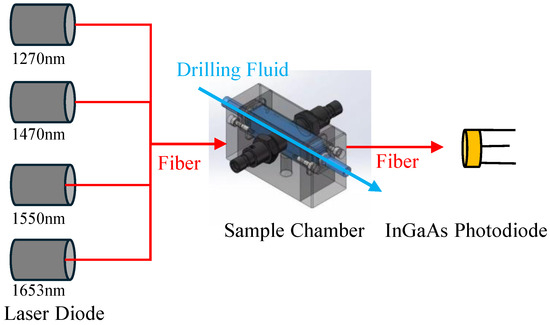 The structural diagram of the optical system. Four laser diodes (LDs) with specific wavelengths are adopted as the light source. A flow cell with an optical path length of 5 mm for dynamic drilling fluid. An InGaAs photodiode is employed as the light receiver, sensitive wavelengths of which range from 400 nm to 1700 nm.