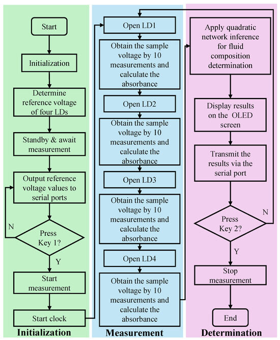 The main program logic flow chart is depicted in Figure 3, primarily including three phases. In the first phase, after initializing the device, the MCU sequentially illuminates each LD and collects its voltage value , referred to as the reference voltage. Note that there is no fluid in the sample chamber at this phase. These values are then uploaded to the computer via a serial port. Next, the hardware waits for the start signal to conduct measurement. In the second phase, the MCU turns on four LDs sequentially to measure the voltage of the sample . This allows us to obtain the absorbance at the specific wavelength by calculating the following expression: