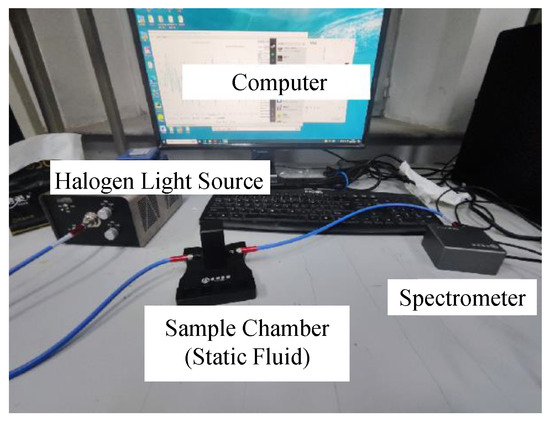 We construct a spectral data acquisition system to collect the spectra of oil, water, and mud filtrate as depicted in Figure 4. The halogen light source, fiber optic spectrometer, and sample chamber are connected via SMA905 interfaces with 400 µm optical fibers. The spectrometer, which operates in the wavelength range of 900–1700 nm with 228 bands, is used to collect the data. The data are then received and stored by a computer.