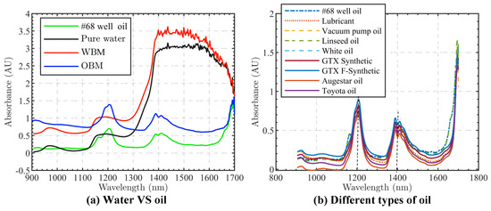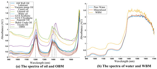 The spectra of all measured fluid. (a) The spectra of different types of oil and OBM, where the absorbance peaks of oils occur at around 1200 nm and 1400 nm. (b) The spectra of water and WBM, where the absorbance peaks of water emerge over 1440 nm.