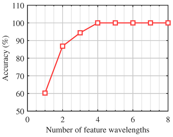 The relation between the number of wavelengths determined by SPA and identification accuracy.