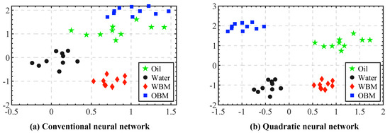 Here, we visualize the extracted features using t-distributed stochastic neighbor embedding (TSNE) [49]. Figure 8 illustrates a comparison between the last layers of conventional and quadratic networks. It is evident that the clusters formed by quadratic networks are more distinct than those formed by conventional networks. This distinction can be attributed to the superior feature extraction capabilities of quadratic networks. In contrast, conventional neural networks struggle to perfectly classify oil and oil-based mud (OBM) as depicted in Figure 8a. The proximity of the oil and OBM clusters can lead to misidentification, a phenomenon also reflected in the classification results.