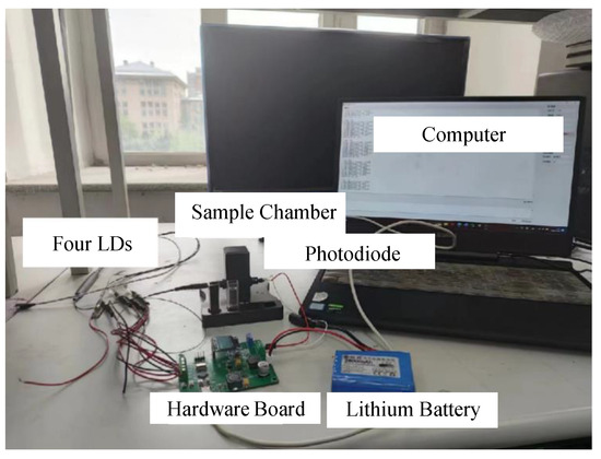The basic components of the optical system include a light source, a sample chamber, and a photodiode. The structure diagram is depicted in Figure 2. We use four laser diodes (LDs) with specific wavelengths as the light source, eliminating the need for filters in the receiver. This allows the optical system to be more lightweight. Additionally, we choose a flow cell with an optical path length of 5 mm to achieve real-time measurement. Finally, we select an InGaAs photodiode as the light receiver. Its sensitive wavelengths range from 400 nm to 1700 nm, which are highly sensitive to the NIR region. At the feature wavelengths determined by our method, the response coefficient of the photodiode ranges from 0.80 to 0.96.