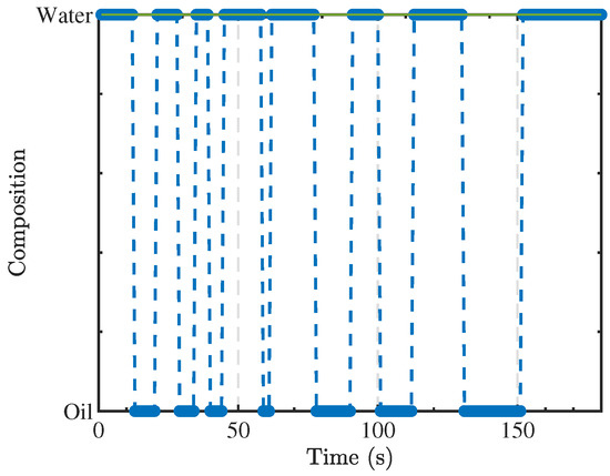 In this experiment, vacuum pump oil and pure water are used as samples for contamination measurement, with the oil volume at 20 mL and water volume at 40 mL. Therefore, the actual oil contamination rate is 0.33. By adjusting the peristaltic pump flow rates (10 mL/min for oil and 15 mL/min for water), we form alternating flows of oil and water in the flow cell. After continuous measurement with our device, we obtain a relation map of the fluid identification results over time as shown in Figure 12. It is clear that the fluid presents a single-phase slug flow, which is consistent with the MWD process.
