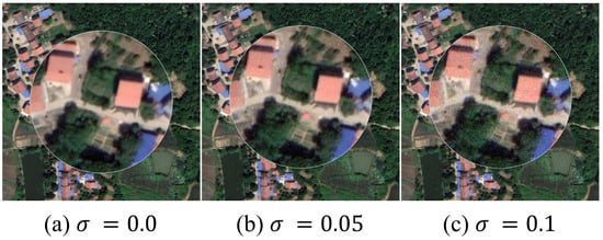 To assess the SCA model’s robustness and transferability, we systematically augmented the LoveDA dataset and Yanqing dataset. We introduced two levels of Gaussian noise ( = 0.05, 0.1) to simulate sensor noise and atmospheric interference (Figure 2). Image contrast was altered using linear contrast stretching with values of −0.4, 0.4, 0.8, and 1.2 to mimic variations in illumination conditions (Figure 3). Furthermore, we generate 3/4, 1/2, and 1/4 resolution versions of the images using bilinear interpolation to evaluate the model’s performance at different spatial resolutions.