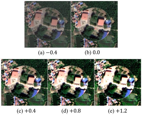 The LoveDA dataset under different contrast conditions. Subplots (a–e) apply linear contrast stretches with values of −0.4, 0.0, 0.4, 0.8, and 1.2, to adjust the image contrast.
