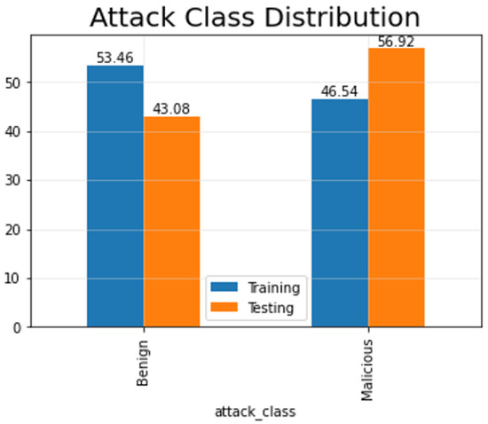 - NSL-KDD [20]: This dataset is an improvement over the original KDD’99 dataset [21,22]. NSL-KDD contains both benign packets representing normal network traffic and malicious packets categorized into four types: Denial of Service (DoS), user-to-root, remote-to-local, and probing attacks. It features 41 attributes, including three categorical and 38 numerical features extracted from TCP/IP connections, traffic windows, and packet content.