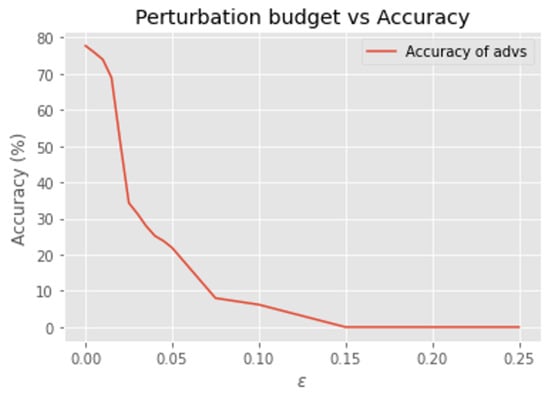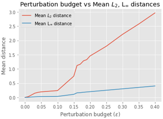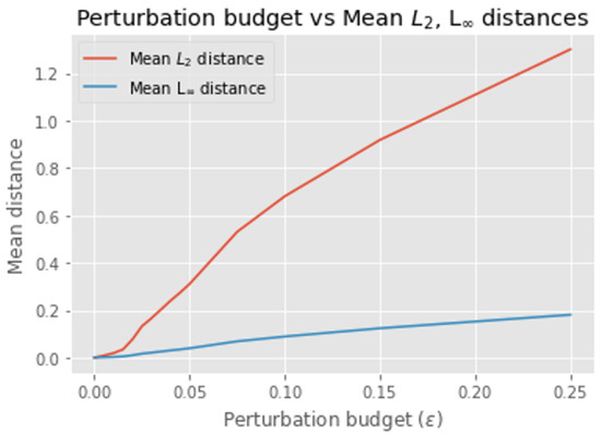 Figure 4 and Figure 5 present the experimental results for the MLPs model. Similar to the LGRs model, as increased the success rate of the PGD attack against the MLPs model rose, while the and distances grew almost linearly. Specifically, when reached 0.18, the model’s accuracy dropped to 0%, corresponding to a 100% ASR. However, unlike the LGRs model, the accuracy for the MLPs model remained stable or changed only slightly when was between 0.03 and 0.1. This behavior may be attributed to the complex properties of neural networks [12].