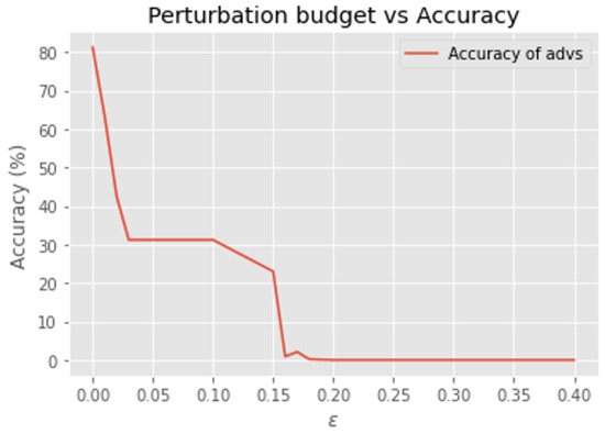 In the context of cybersecurity, the features extracted from network packets can be perturbed to generate adversarial packets using the PGD attack. The restriction imposed by ensures that the perturbations remain realistic, preventing excessive modification of the packets and preserving the malicious characteristics of the adversarial examples. Moreover, the PGD attack cannot be directly applied to models with non-differentiable loss functions, as it requires explicit calculation of . Therefore, in this study, we applied the PGD attack only to the LGR and MLP models.