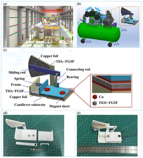 Application scenarios and fabrication of the CR-SC TENG. (a) Application scenarios of the CR-SC TENG; (b) installation of the CR-SC TENG on an air compressor; (c) structural composition of the CR-SC TENG; (d) real-life images of the CR-SC TENG components; (e) fully assembled structure of the CR-SC TENG.