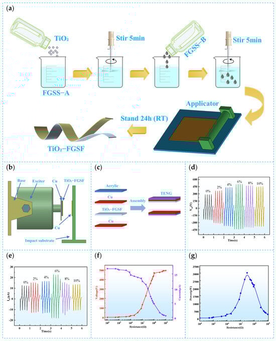 Fabrication and analysis of TiO2-FGSF. (a) Fabrication process of TiO2-FGSF; (b) schematic of the experimental triboelectric nanogenerator; (c) vibration testing platform; (d) open-circuit voltage for different doping ratios; (e) short-circuit current for different doping ratios; (f) output voltage and current under various loads; (g) output power under various loads.
