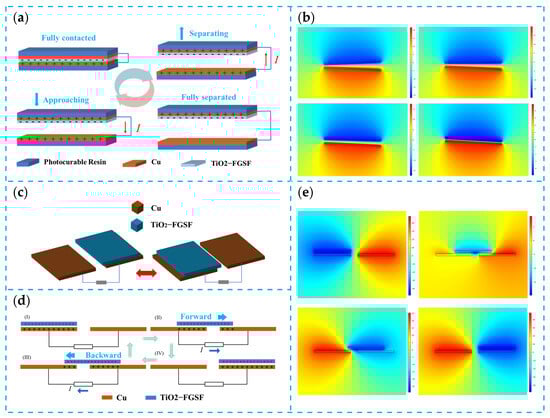 Working principle of the CR-SC TENG. (a) Vertical contact separation mode power generation principle (first power generation unit); (b) simulation of the power generation principle in contact separation mode; (c) schematic of the freestanding sliding mode (second power generation unit); (d) power generation principle of the freestanding sliding mode; (e) simulation of the freestanding sliding mode during operation.