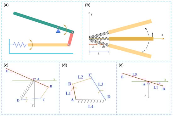 Physical model of the CR-SC TENG. (a) Schematic of the physical model of the CR-SC TENG; (b) schematic of the spring cantilever section model; (c) equivalent physical model of the CR-SC TENG; (d) crank-rocker mechanism model; (e) lever amplification model.