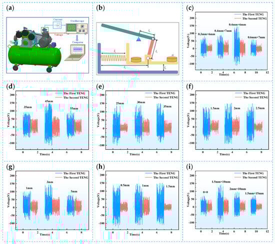 Output performance of the CR-SC TENG with different structural parameters. (a) Schematic of the experimental platform; (b) simplified schematic of the CR-SC TENG structure; (c) effect of spring parameters on Voc; (d) effect of crank length on Voc; (e) effect of connecting rod length on Voc; (f) effect of rocker (driving arm) length on Voc; (g) effect of distance from the cantilever base to the frame base’s upper surface (distance between the first friction layers) on Voc; (h) effect of distance between the sliding rod and frame side (distance between the second friction layers) on Vocc; (i) effect of additional magnetic sheet mass on Vocc.