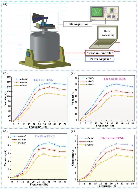 Output performance of the CR-SC TENG under various external excitation conditions. (a) Experimental platform for testing the output of the CR-SC TENG; (b) open-circuit voltage of the first output unit of the CR-SC TENG as a function of frequency under different acceleration levels; (c) short-circuit current of the first output unit of the CR-SC TENG as a function of frequency under different acceleration levels; (d) open-circuit voltage of the second output unit of the CR-SC TENG as a function of frequency under different acceleration levels; (e) short-circuit current of the second output unit of the CR-SC TENG as a function of frequency under different acceleration levels.