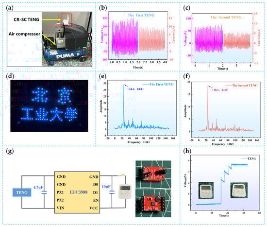 Practical applications of the CR-SC TENG. (a) Operation of the CR-SC TENG on an air compressor; (b) open-circuit voltage and short-circuit current outputs of the first triboelectric nanogenerator unit; (c) open-circuit voltage and short-circuit current outputs of the second triboelectric nanogenerator unit; (d) CR-SC TENG powering 118 LED lights; (e) FFT result of the open-circuit voltage signal from the first triboelectric nanogenerator unit; (f) FFT result of the open-circuit voltage signal from the second triboelectric nanogenerator unit; (g) power management circuit for the triboelectric nanogenerator; (h) output voltage variation in the CR-SC TENG with the power management circuit.