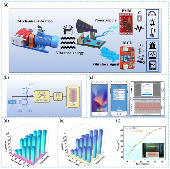 The wireless monitoring module operates by capturing and processing analog voltage signals. As shown in Figure 8b, the module first uses the ADC pin of an STC8G1K08A-36I-SOP8 microcontroller to collect signals from the triboelectric nanogenerator output. To protect the microcontroller from high voltage, a bidirectional DVS diode is added to the generator output. The internal voltage divider network of the module consists of pull-up resistors (a fixed 100 K and an adjustable 1 M) and pull-down resistors (with the same configuration) to form a voltage divider. The AC current generated by the triboelectric nanogenerator passes through the pull-down resistor, creating corresponding voltage changes across the resistor according to Ohm’s law. These voltage variations reflect the operating status of the generator. The ADC pin of the microcontroller can then monitor these voltage changes in real time, indicating the working status of the CR-SC TENG and, consequently, the condition of the equipment. The monitoring module transmits the captured voltage signal to a Bluetooth app every 10 milliseconds, as shown in Figure 8c, with the option to adjust to real-time transmission at a frequency of less than 1 millisecond if needed. Figure 8d,e show the open-circuit voltage monitored at different frequencies using an oscilloscope and the wireless monitoring module, respectively, while Figure 8f compares the open-circuit voltage data from both. The monitoring results indicate that the error between the open-circuit voltage measured by the oscilloscope and the wireless monitoring module is less than 3%, demonstrating the wireless monitoring system’s high accuracy and stability.