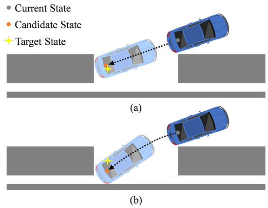 When , is also referred to as Euclidean distance. When , is also known as Manhattan distance. In the merging stage, this heuristic design can offer valuable guidance. However, during the posture adjustment stage, the expansion of the trajectory tree does not always prioritize proximity to the target node. Potentially optimal nodes may deviate from or move away from the target node because they provide a larger space for maneuvering. Using the distance from the target pose as heuristic information cannot accurately capture this process, leading to reduced efficiency in trajectory tree expansion during the posture adjustment stage. As shown in Figure 2, the candidate states in (a) and (b) are generated by moving straight backward or executing a right turn behind. If the heuristic function calculates the Euclidean distance between the target state and the candidate state, then (a) is considered superior. However, during the posture adjustment stage, the candidate state in (b) can lead to faster convergence of the trajectory tree.