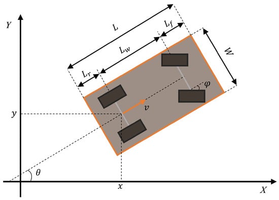 The goal of trajectory planning is to find a state variable sequence and control variable sequence between the starting state and target state without collision with obstacles. These state and control variable sequences must adhere to the vehicle’s kinematic constraints. Here, denotes the midpoint along the rear-wheel axis, denotes the heading angle with respect to the x axis, v represents the velocity of , a refers to the acceleration, represents the steering angle of the front wheels, refers to the corresponding angular velocity, and represents the time sequence corresponding to each trajectory point. The total number of trajectory points is denoted by n. Some geometric and kinematic parameters of the vehicle are illustrated in Figure 3, in which L denotes the vehicle length, denotes the length of the front overhang, denotes the length of the rear overhang, denotes the length of the wheelbase, and W denotes the vehicle width.